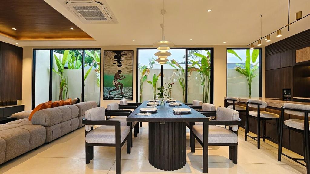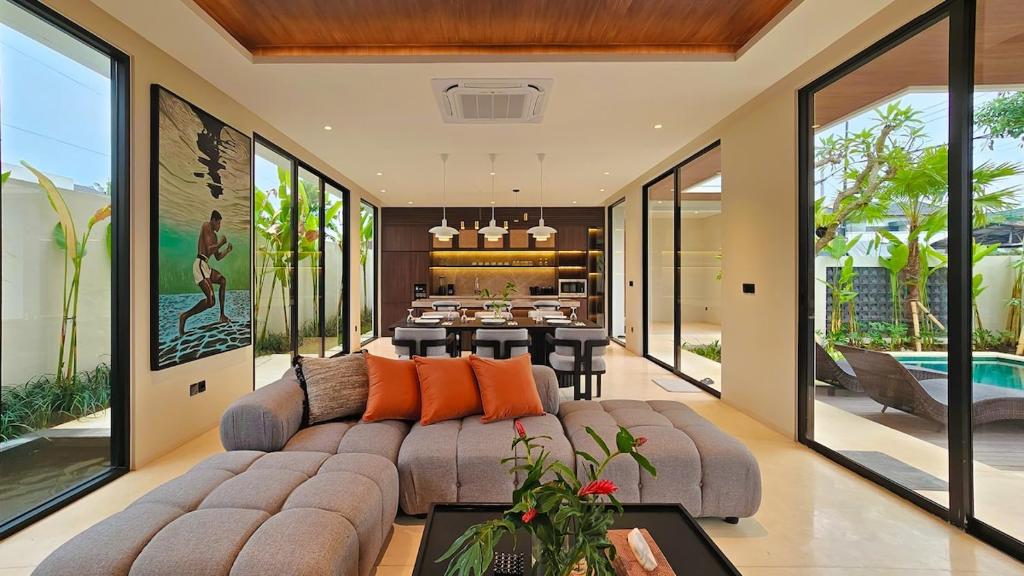 Mengusung desain minimalis dan ruang terbuka. Sangat direkomendasikan untuk liburan bersama keluarga. Living room yang menyatu dengan dining room dan kitchen membuat anak-anak jadi lebih leluasa untuk bermain. Ditambah lagi area outdoor yang sangat memadahi.