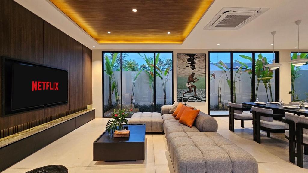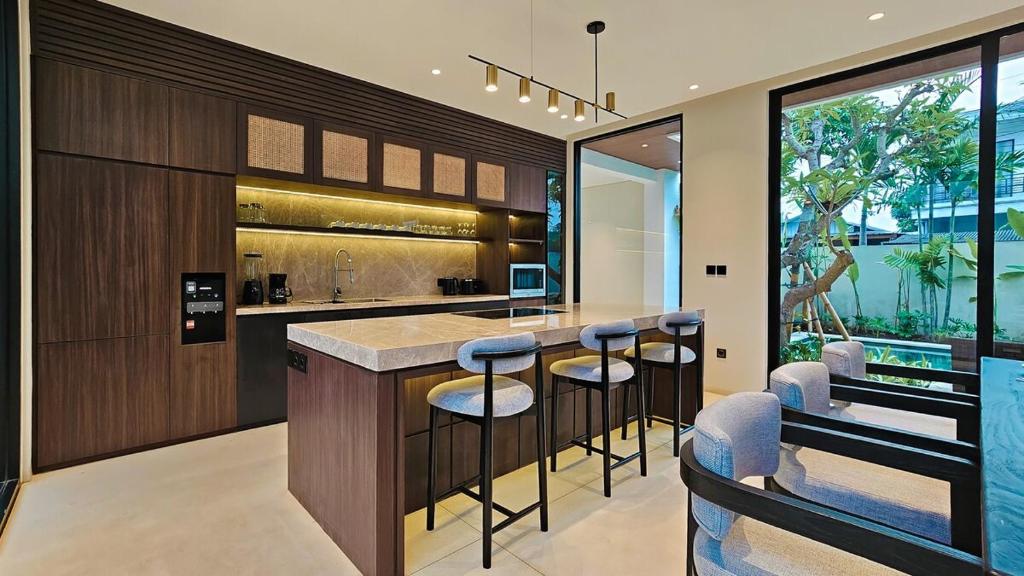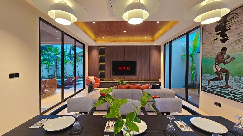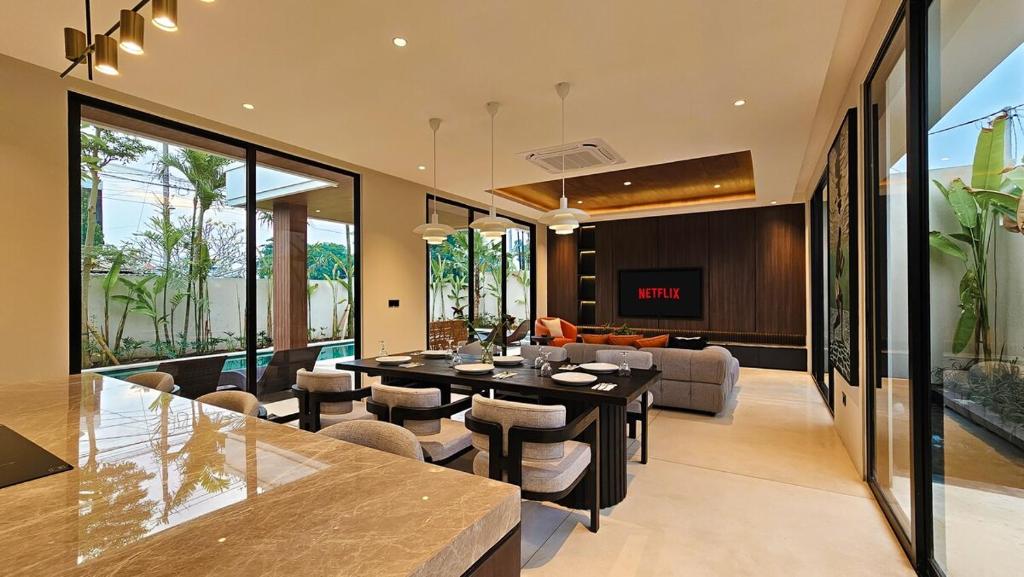 Mengusung desain minimalis dan ruang terbuka. Sangat direkomendasikan untuk liburan bersama keluarga. Living room yang menyatu dengan dining room dan kitchen membuat anak-anak jadi lebih leluasa untuk bermain. Ditambah lagi area outdoor yang sangat memadahi.