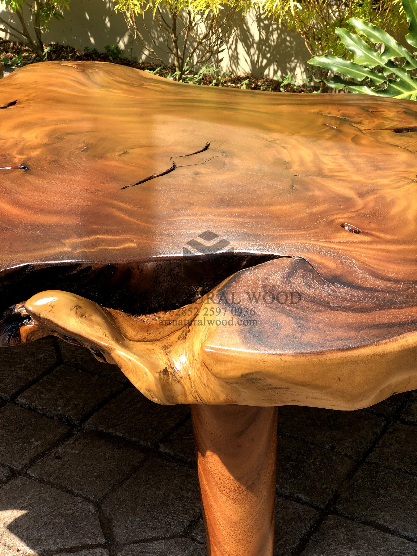 Pertama kami sampaikan bahwa Art Natural Wood melayani custom finishing untuk para konsumen, sehingga konsumen berhak menentukan warna finishing produk yang dikehendaki. Untuk produk ini kami menggunakan finishing natural. Finishing natural sangat cocok bila dipadankan dengan produk-produk yang terbuat dari kayu trembesi solid (Suar Wood), Karena tidak menghilangkan kesan atau motif urat kayu.