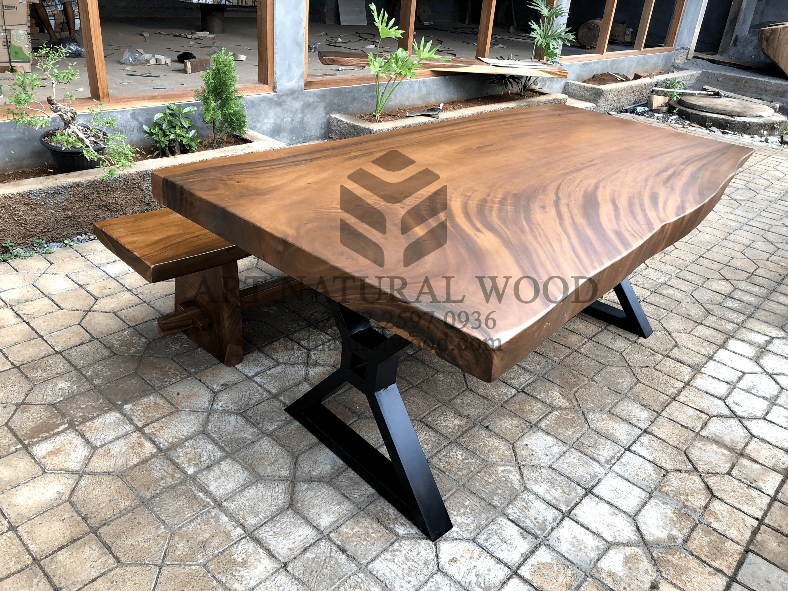 Meja bangku makan minimalis ini menggunakan bahan baku Kayu Trembesi utuh (Suar Wood) dan ditambah dengan konstruksi/purus. Produk-produk dari Art Natural Wood dekerjakan oleh para profesional dibidang furniture dari Jepara. Dikerjakan dengan teliti dan cermat sehingga furniture ini menjadi produk yang kokoh, kuat dan memiliki fungsi guna.