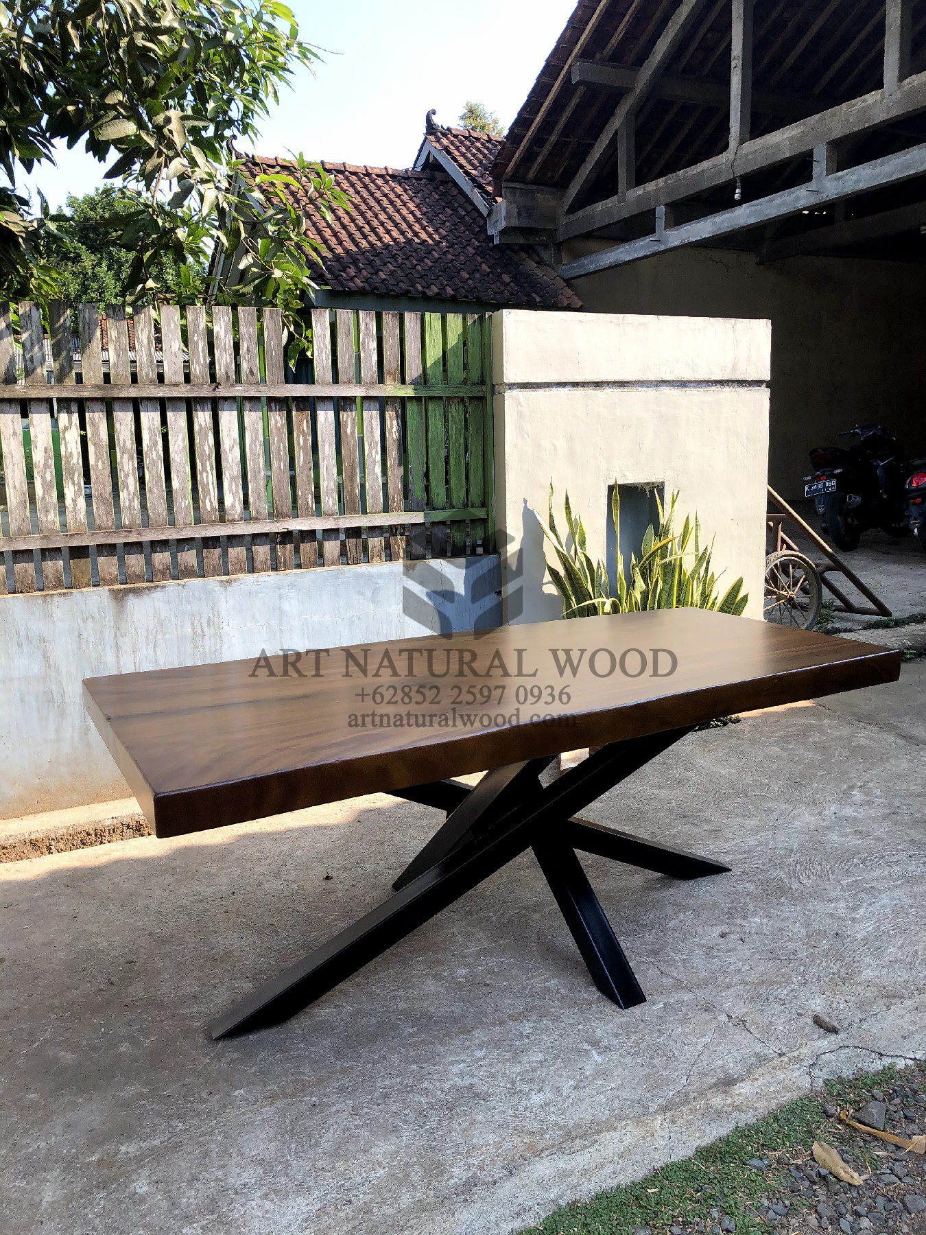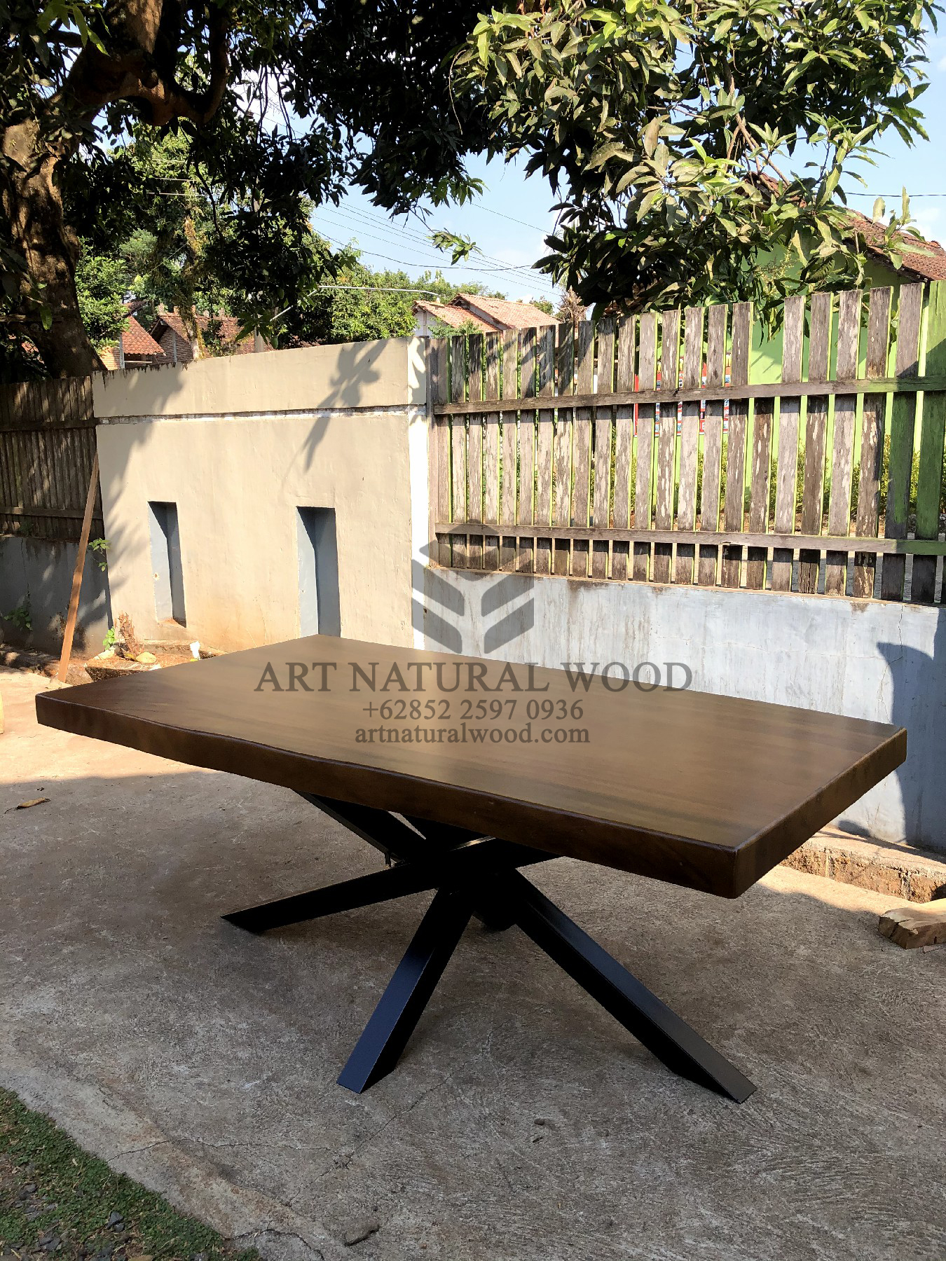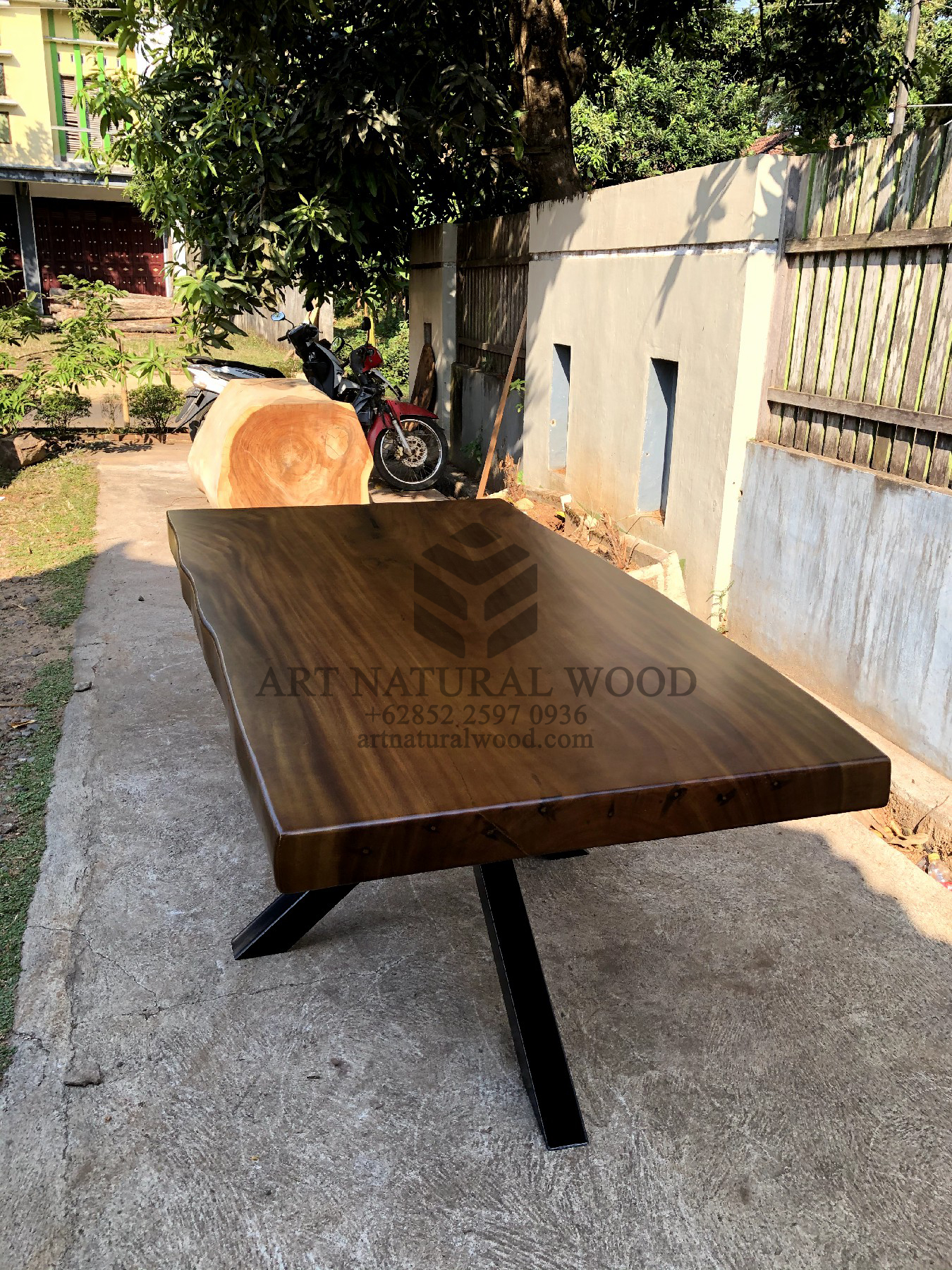 Meja kayu kaki besi ini menggunakan bahan baku Kayu Trembesi utuh (Suar Wood) dan ditambah dengan konstruksi/purus. Produk-produk dari Art Natural Wood dekerjakan oleh para profesional dibidang furniture dari Jepara. Dikerjakan dengan teliti dan cermat sehingga furniture ini menjadi produk yang kokoh, kuat dan memiliki fungsi guna.
