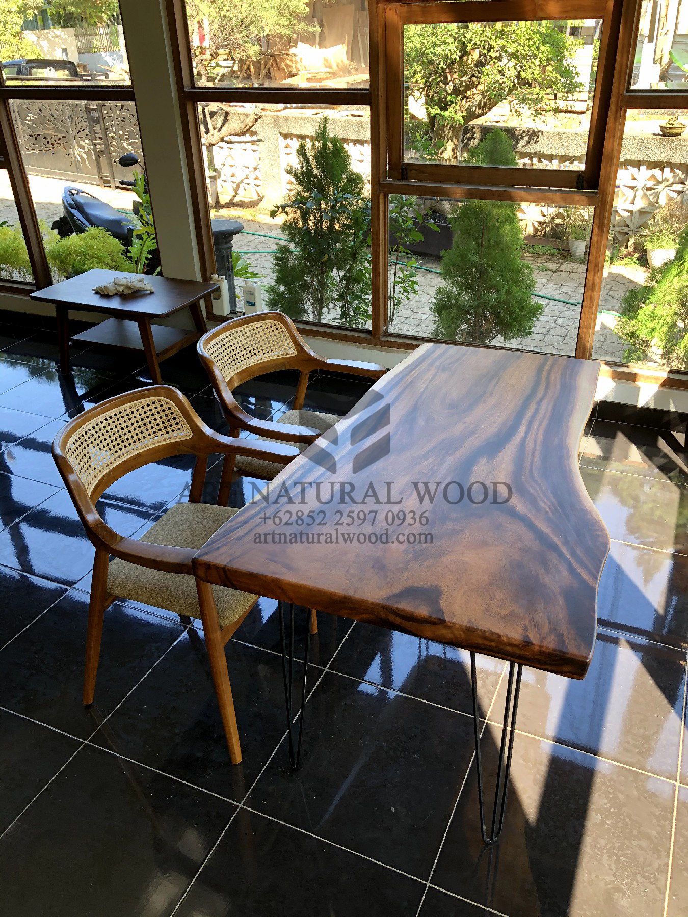 Pertama kami sampaikan bahwa Art Natural Wood melayani custom finishing untuk para konsumen sehingga konsumen berhak menentukan warna finishing produk yang dikehendaki. Untuk produk ini kami menggunakan finishing natural. Finishing natural sangat cocok bila dipadankan dengan produk-produk yang terbuat dari kayu trembesi solid (Suar Wood), Karena tidak menghilangkan kesan atau motif urat kayu.