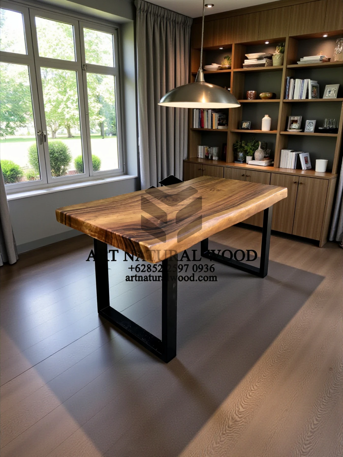 Meja makan minimalis ini menggunakan bahan baku Kayu Trembesi utuh (Suar Wood) dan ditambah dengan konstruksi/purus. Produk-produk dari Art Natural Wood dekerjakan oleh para profesional dibidang furniture dari Jepara. Dikerjakan dengan teliti dan cermat sehingga furniture ini menjadi produk yang kokoh, kuat dan memiliki fungsi guna.