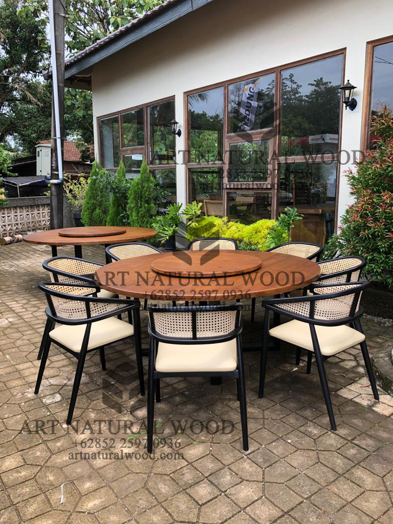 Meja makan putar ini menggunakan bahan baku Kayu Jati utuh (Teak Wood) dan ditambah dengan konstruksi/purus. Produk-produk dari Art Natural Wood dekerjakan oleh para profesional dibidang furniture dari Jepara. Dikerjakan dengan teliti dan cermat sehingga furniture ini menjadi produk yang kokoh, kuat dan memiliki fungsi guna.