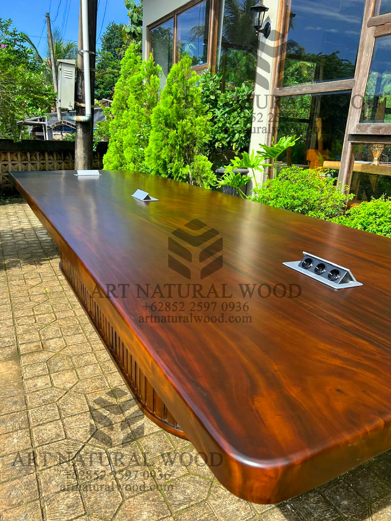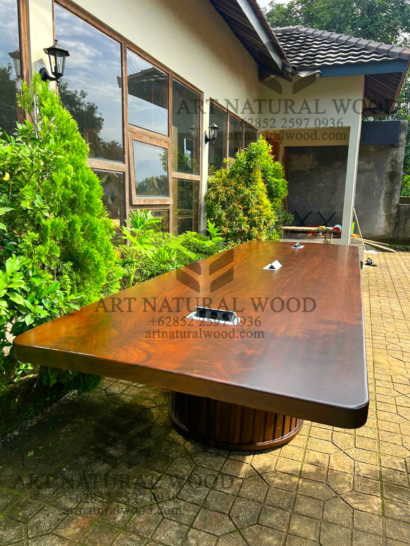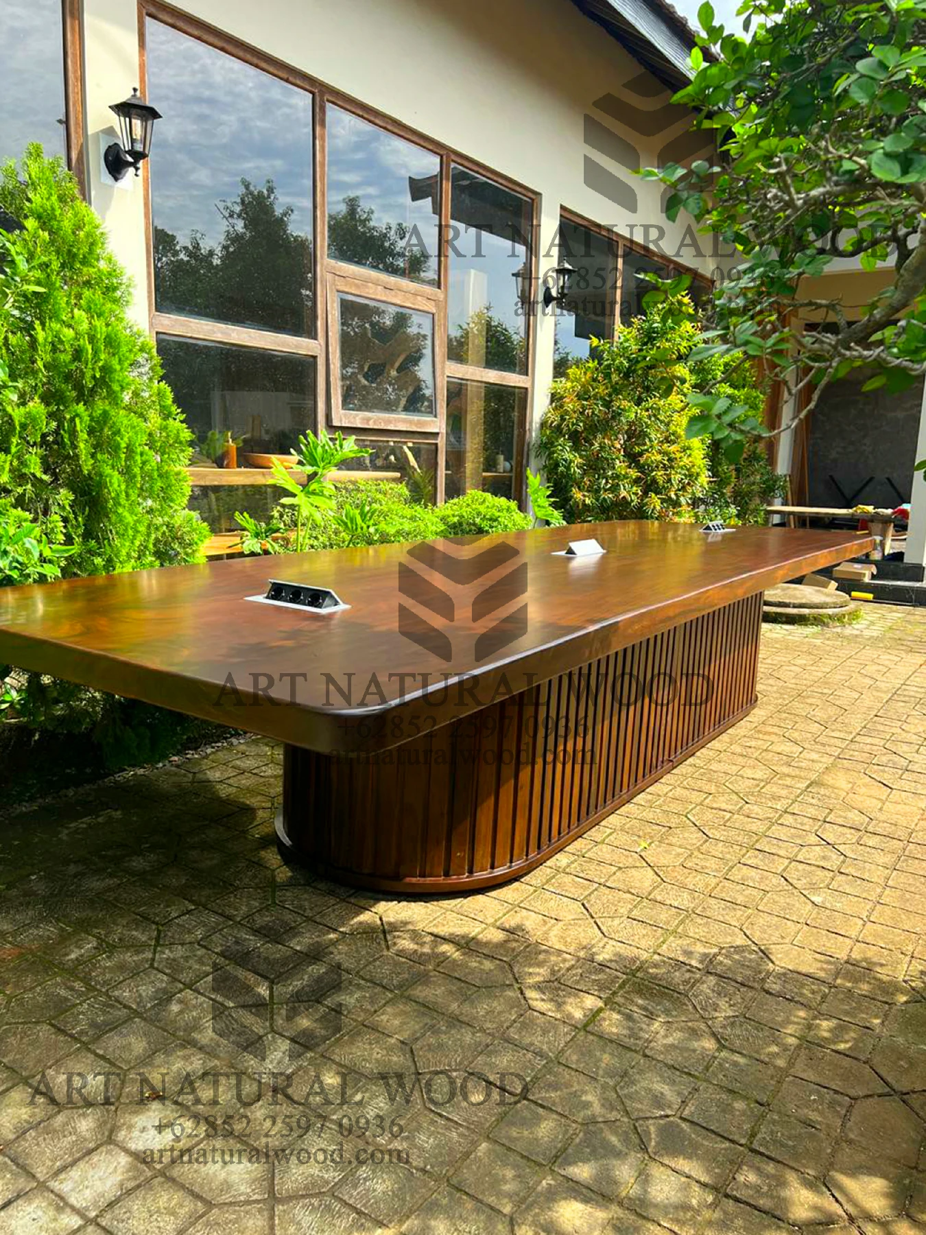 Meja meeting kantor ini menggunakan bahan baku Kayu Trembesi solid (Suar Wood) dan ditambah dengan konstruksi/purus. Produk-produk dari Art Natural Wood dekerjakan oleh para profesional dibidang furniture dari Jepara. Dikerjakan dengan teliti dan cermat sehingga furniture ini menjadi produk yang kokoh, kuat dan memiliki fungsi guna.