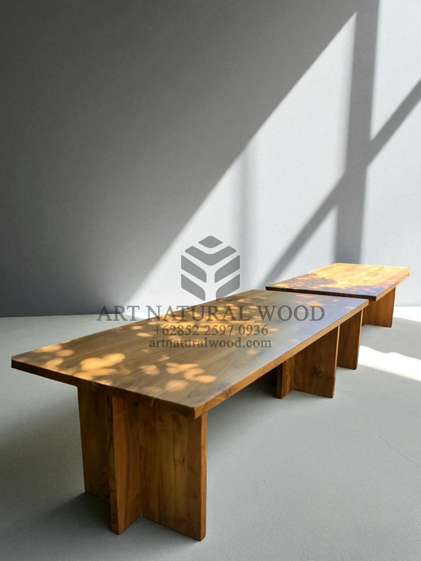Meja meeting kayu ini menggunakan bahan baku Kayu Jati utuh (Teak Wood) dan ditambah dengan konstruksi/purus. Produk-produk dari Art Natural Wood dekerjakan oleh para profesional dibidang furniture dari Jepara. Dikerjakan dengan teliti dan cermat sehingga furniture ini menjadi produk yang kokoh, kuat dan memiliki fungsi guna.
