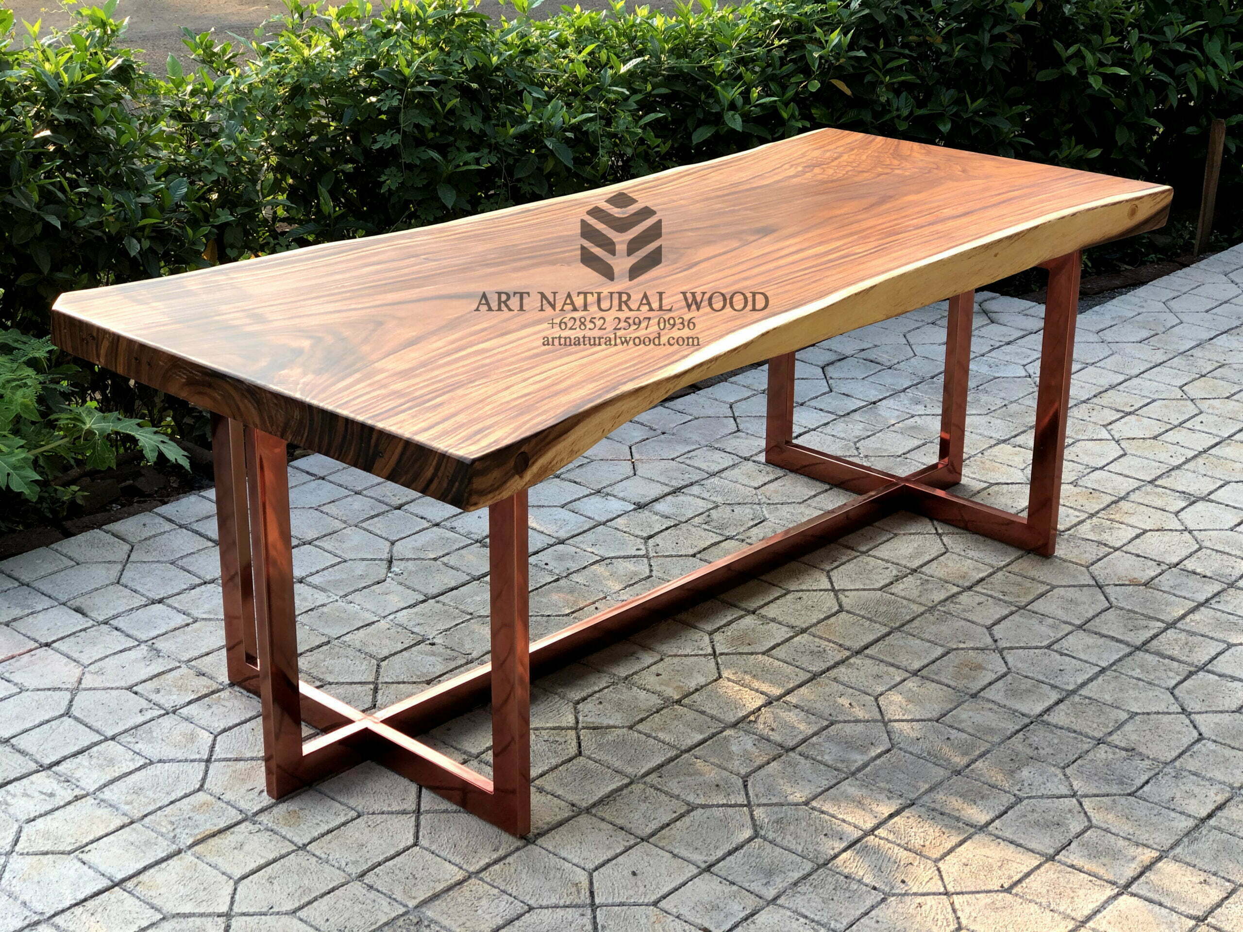 Meja rapat panjang kayu solid ini menggunakan bahan baku Kayu Trembesi utuh (Suar Wood), kaki-kaki besi dengan sentuhan warna emas sebagai aksen tambahan dan ditambah dengan konstruksi/purus. Produk-produk dari Art Natural Wood dekerjakan oleh para profesional dibidang furniture dari Jepara. Dikerjakan dengan teliti dan cermat sehingga furniture ini menjadi produk yang kokoh, kuat dan memiliki fungsi guna.