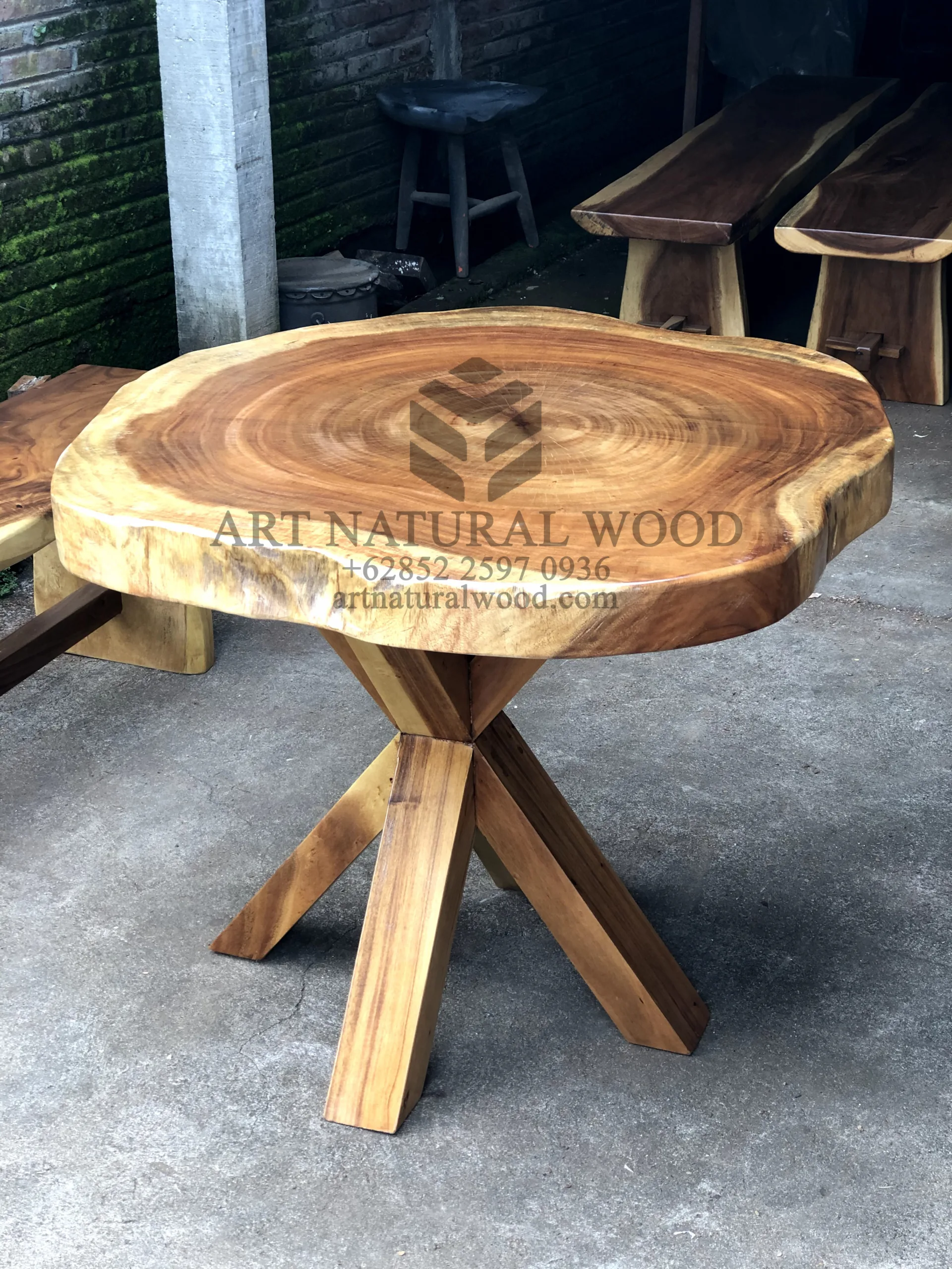 meja tamu bundar alami kayu trembesi