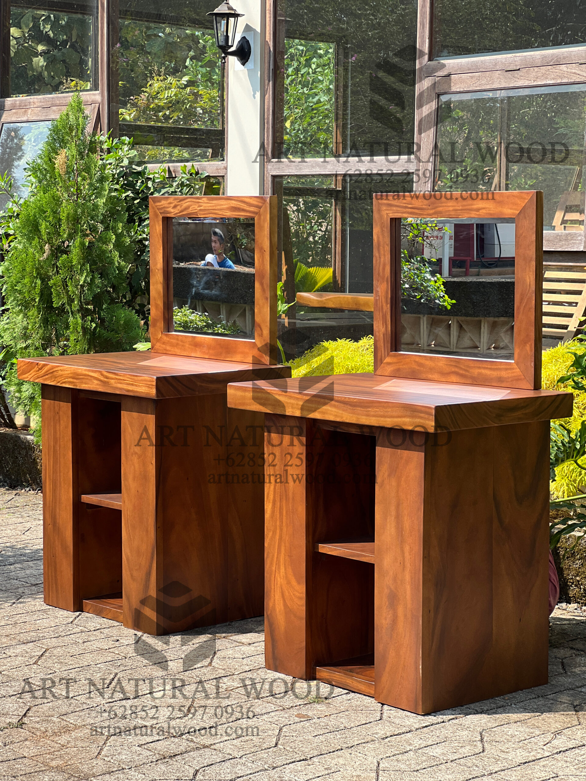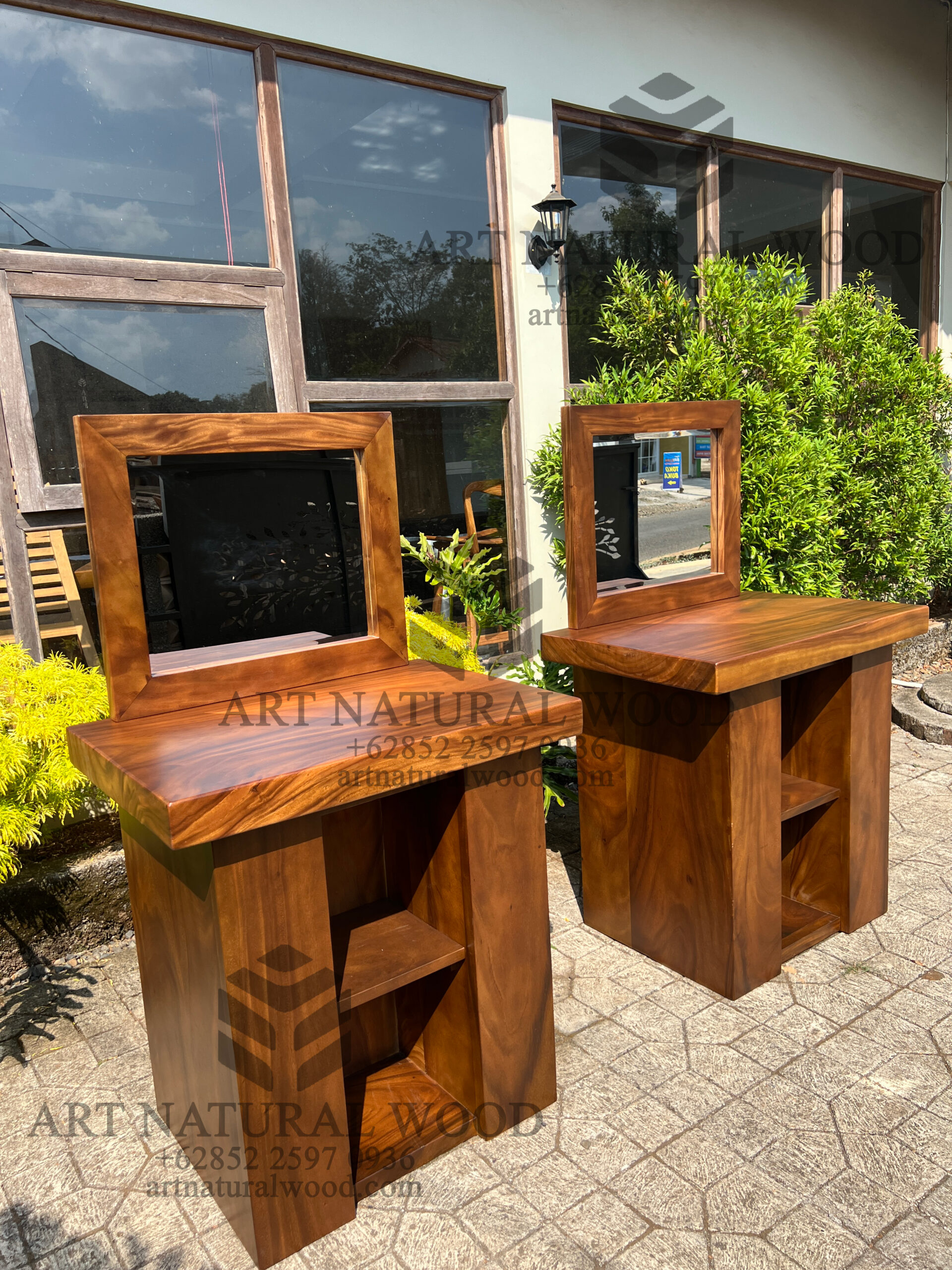 Meja wastafel minimalis ini menggunakan bahan baku Kayu Jati dan Trembesi solid dan ditambah dengan konstruksi/purus. Produk-produk dari Art Natural Wood dekerjakan oleh para profesional dibidang furniture dari Jepara. Dikerjakan dengan teliti dan cermat sehingga furniture ini menjadi produk yang kokoh, kuat dan memiliki fungsi guna.