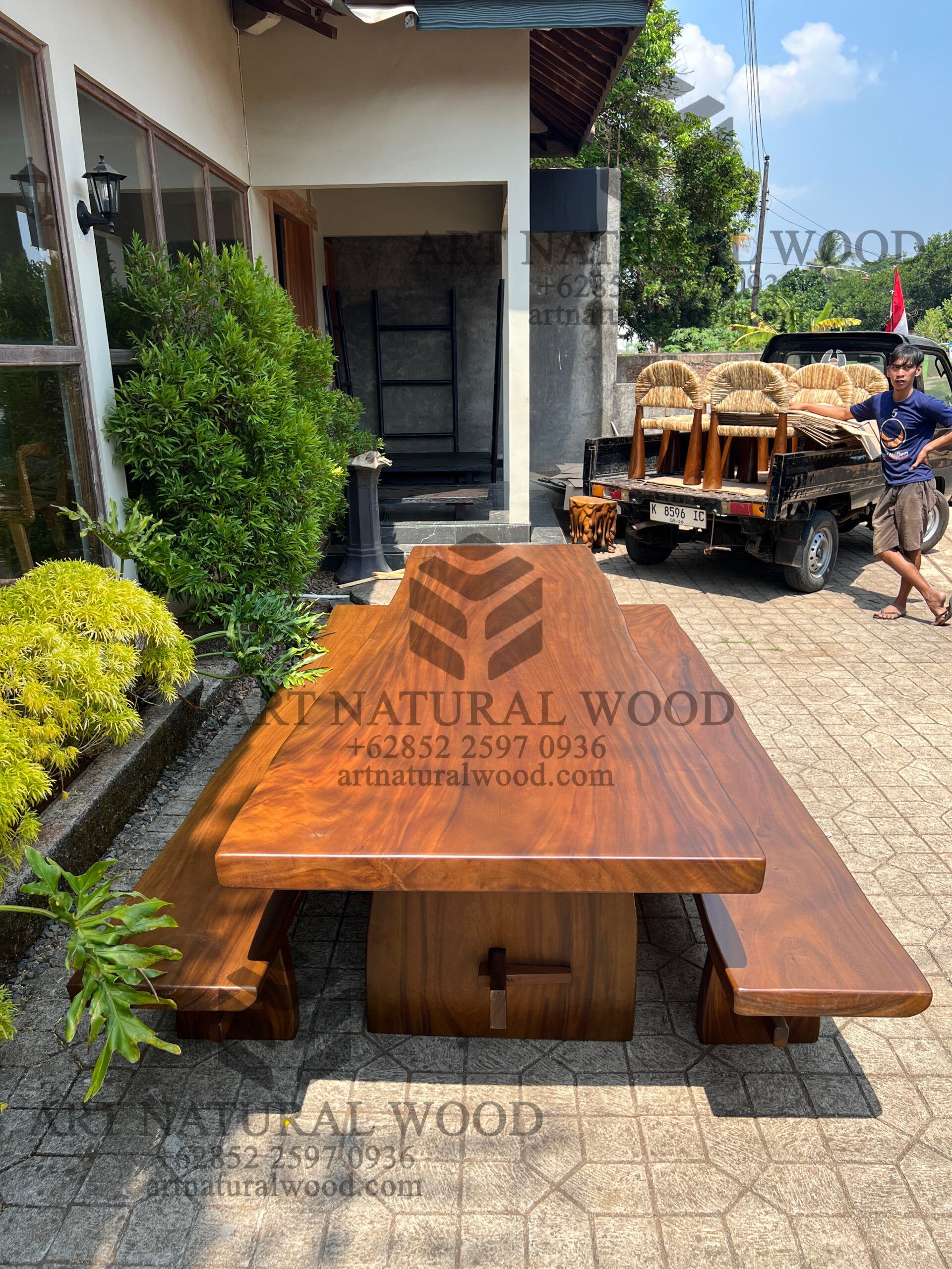 Set meja makan kayu ini menggunakan bahan baku Kayu Trembesi utuh (Suar Wood) dan ditambah dengan konstruksi/purus. Produk-produk dari Art Natural Wood dekerjakan oleh para profesional dibidang furniture dari Jepara. Dikerjakan dengan teliti dan cermat sehingga furniture ini menjadi produk yang kokoh, kuat dan memiliki fungsi guna.