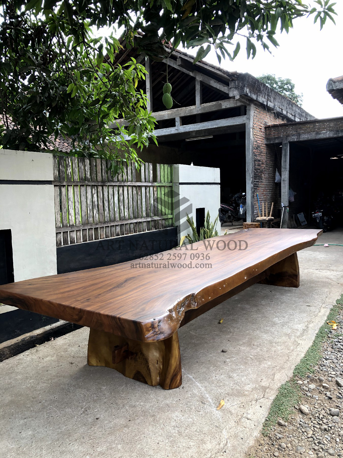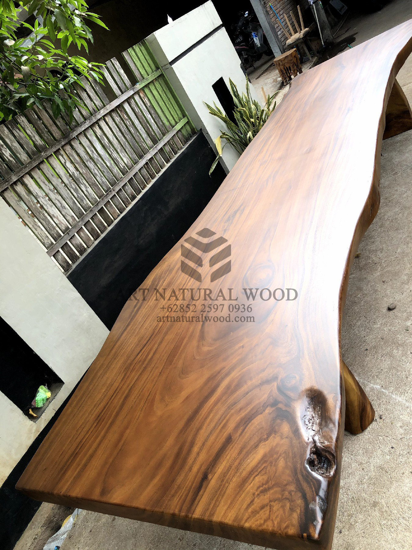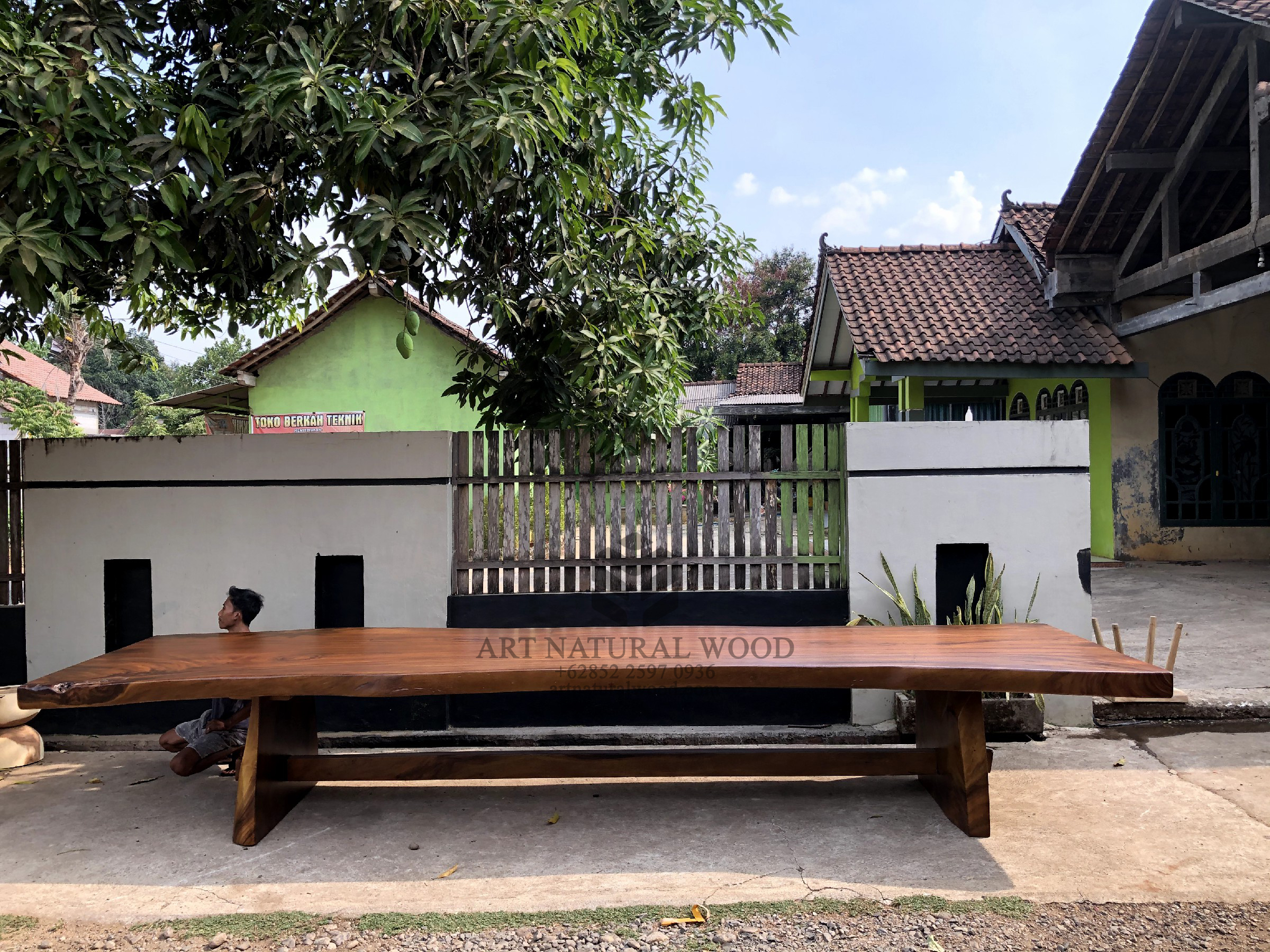 Meja kayu besar ini menggunakan bahan baku Kayu Trembesi utuh (Suar Wood) dan ditambah dengan konstruksi/purus. Produk-produk dari Art Natural Wood dekerjakan oleh para profesional dibidang furniture dari Jepara. Dikerjakan dengan teliti dan cermat sehingga furniture ini menjadi produk yang kokoh, kuat dan memiliki fungsi guna.