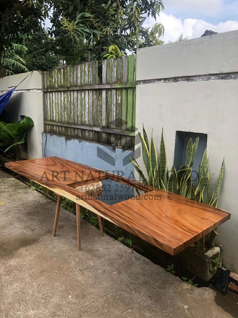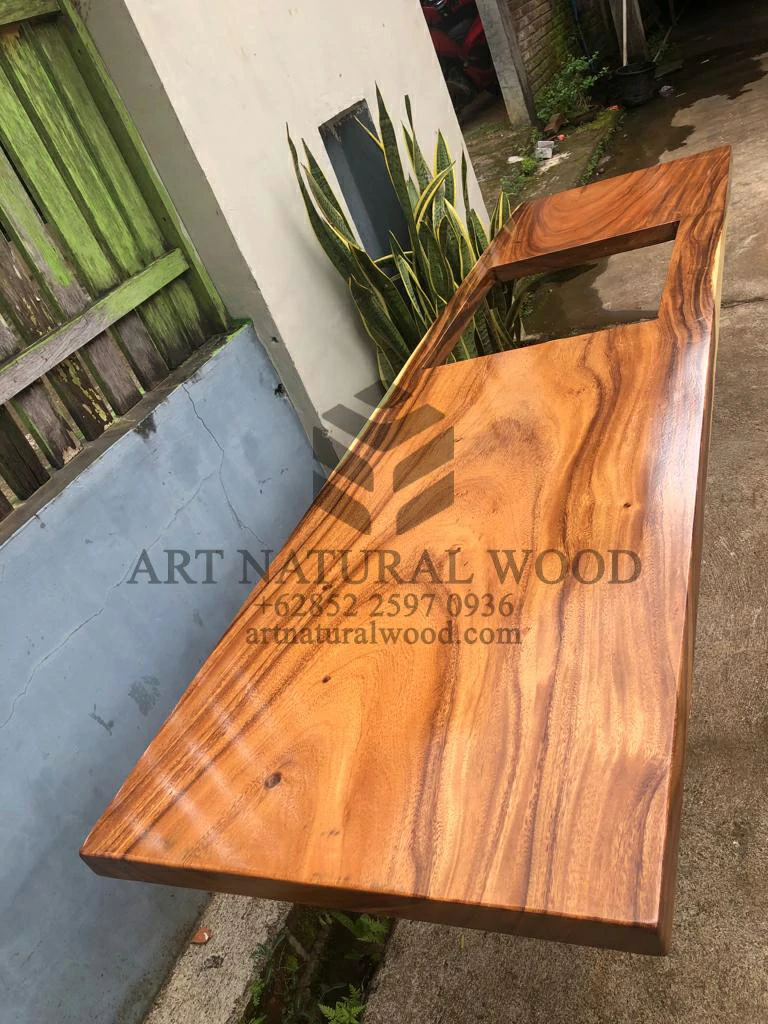 Pertama kami sampaikan bahwa Art Natural Wood melayani custom finishing untuk para konsumen, sehingga konsumen berhak menentukan warna finishing produk yang dikehendaki. Untuk produk ini kami menggunakan finishing natural. Finishing natural sangat cocok bila dipadankan dengan produk-produk yang terbuat dari kayu trembesi solid (Suar Wood), Karena tidak menghilangkan kesan atau motif urat kayu.