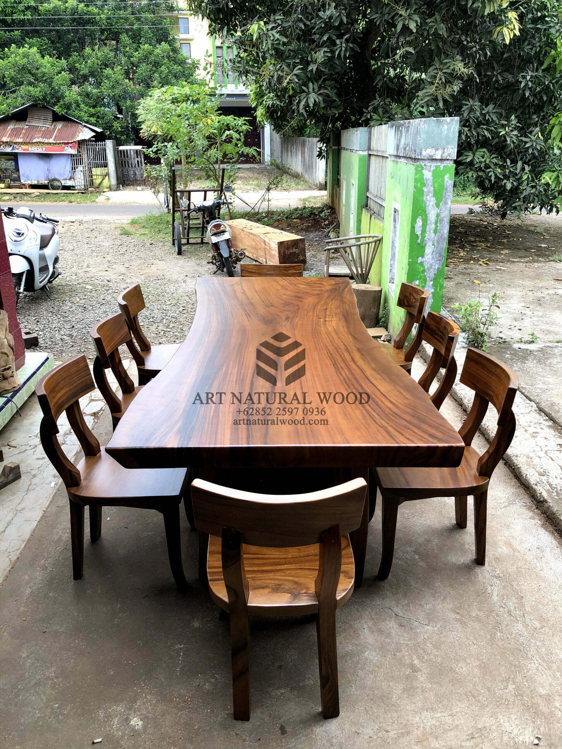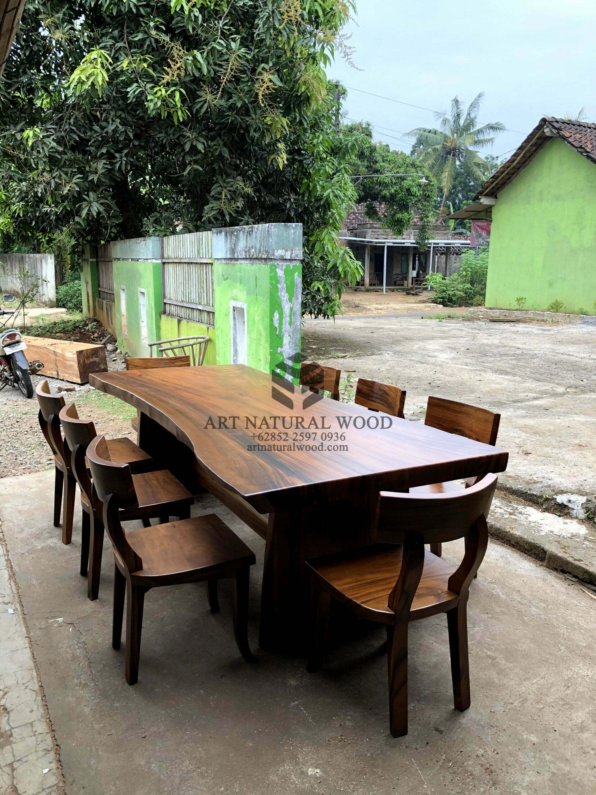 Meja makan kayu besar ini menggunakan bahan baku Kayu Trembesi utuh (Suar Wood) dan ditambah dengan konstruksi/purus. Produk-produk dari Art Natural Wood dekerjakan oleh para profesional dibidang furniture dari Jepara. Dikerjakan dengan teliti dan cermat sehingga furniture ini menjadi produk yang kokoh, kuat dan memiliki fungsi guna.