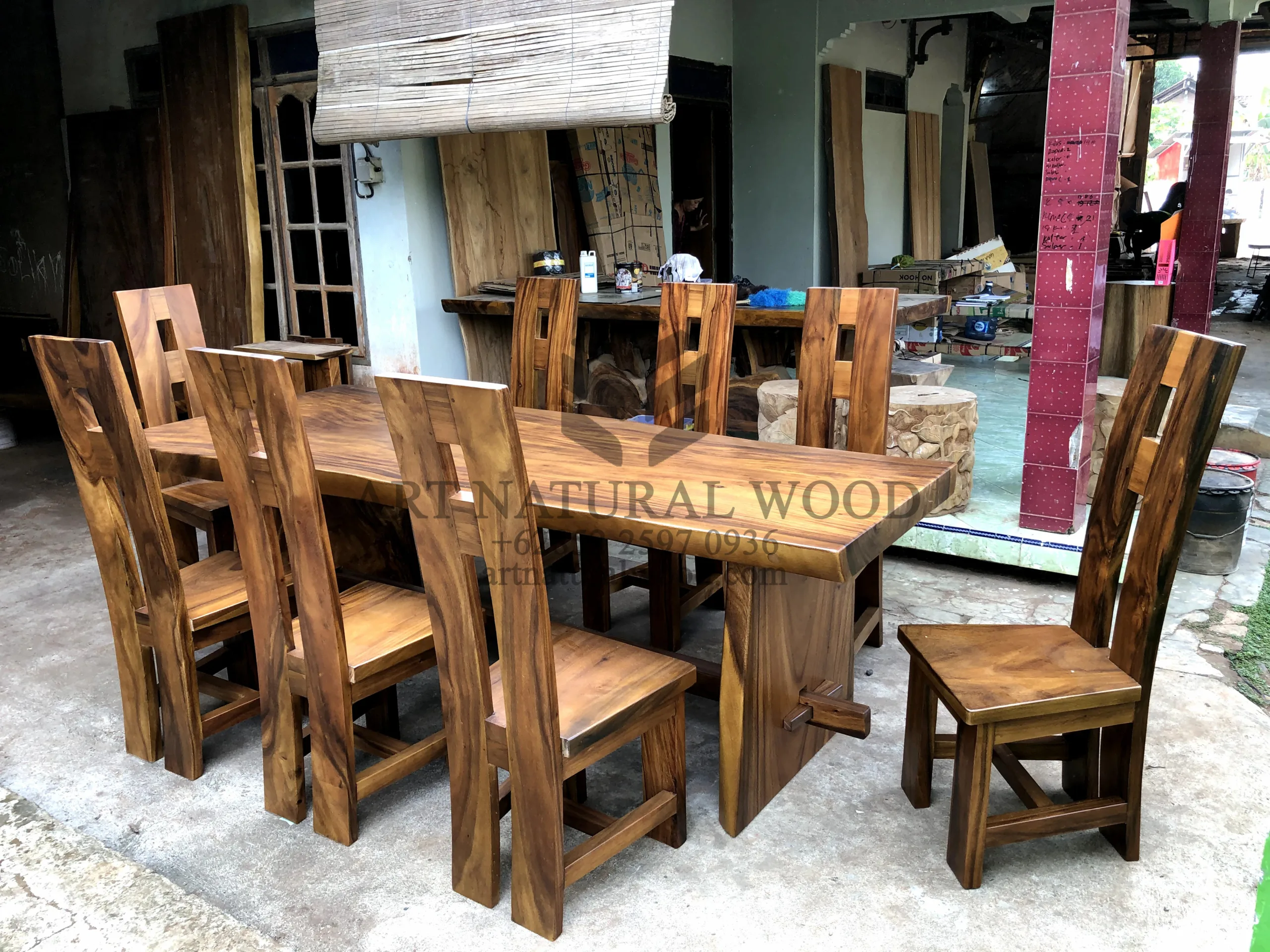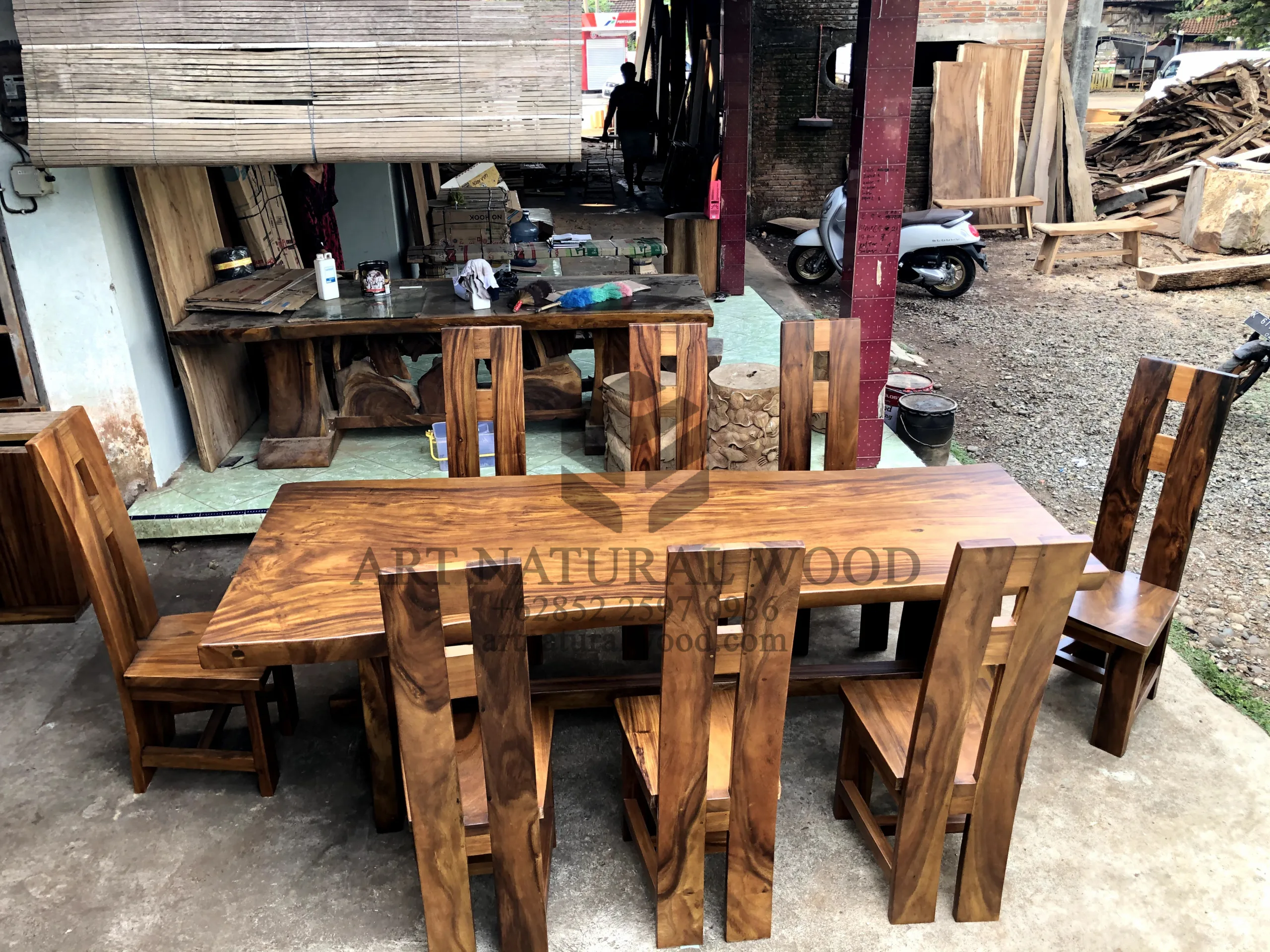 Meja makan kayu trembesi minimalis alami ini menggunakan bahan baku Kayu Trembesi utuh (Suar Wood) dan ditambah dengan konstruksi/purus. Produk-produk dari Art Natural Wood dekerjakan oleh para profesional dibidang furniture dari Jepara. Dikerjakan dengan teliti dan cermat sehingga furniture ini menjadi produk yang kokoh, kuat dan memiliki fungsi guna.