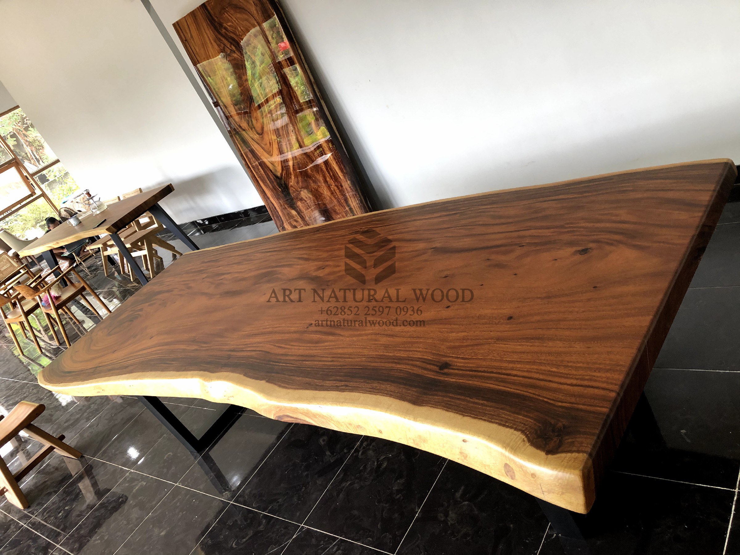 Pertama kami sampaikan bahwa Art Natural Wood melayani custom finishing untuk para konsumen, sehingga konsumen berhak menentukan warna finishing produk yang dikehendaki. Untuk produk ini kami menggunakan finishing natural. Finishing natural sangat cocok bila dipadankan dengan produk-produk yang terbuat dari kayu trembesi solid (Suar Wood), Karena tidak menghilangkan kesan atau motif urat kayu.