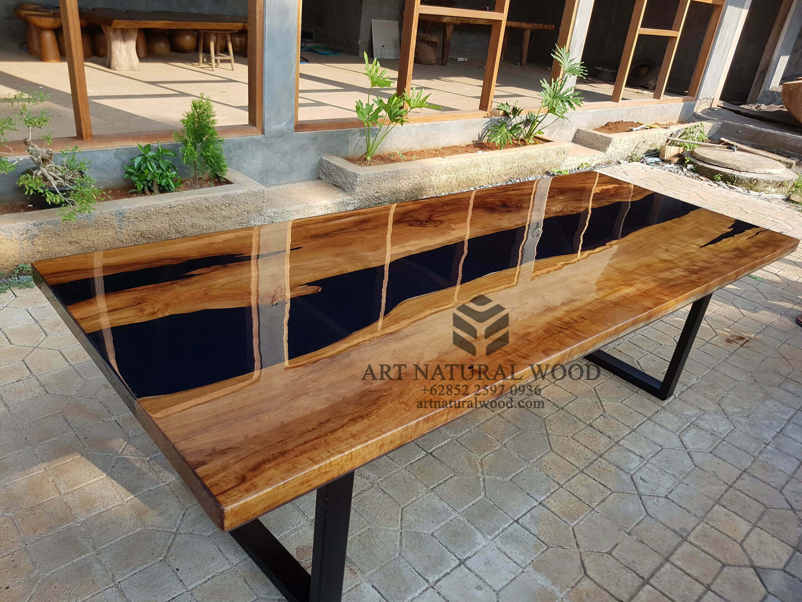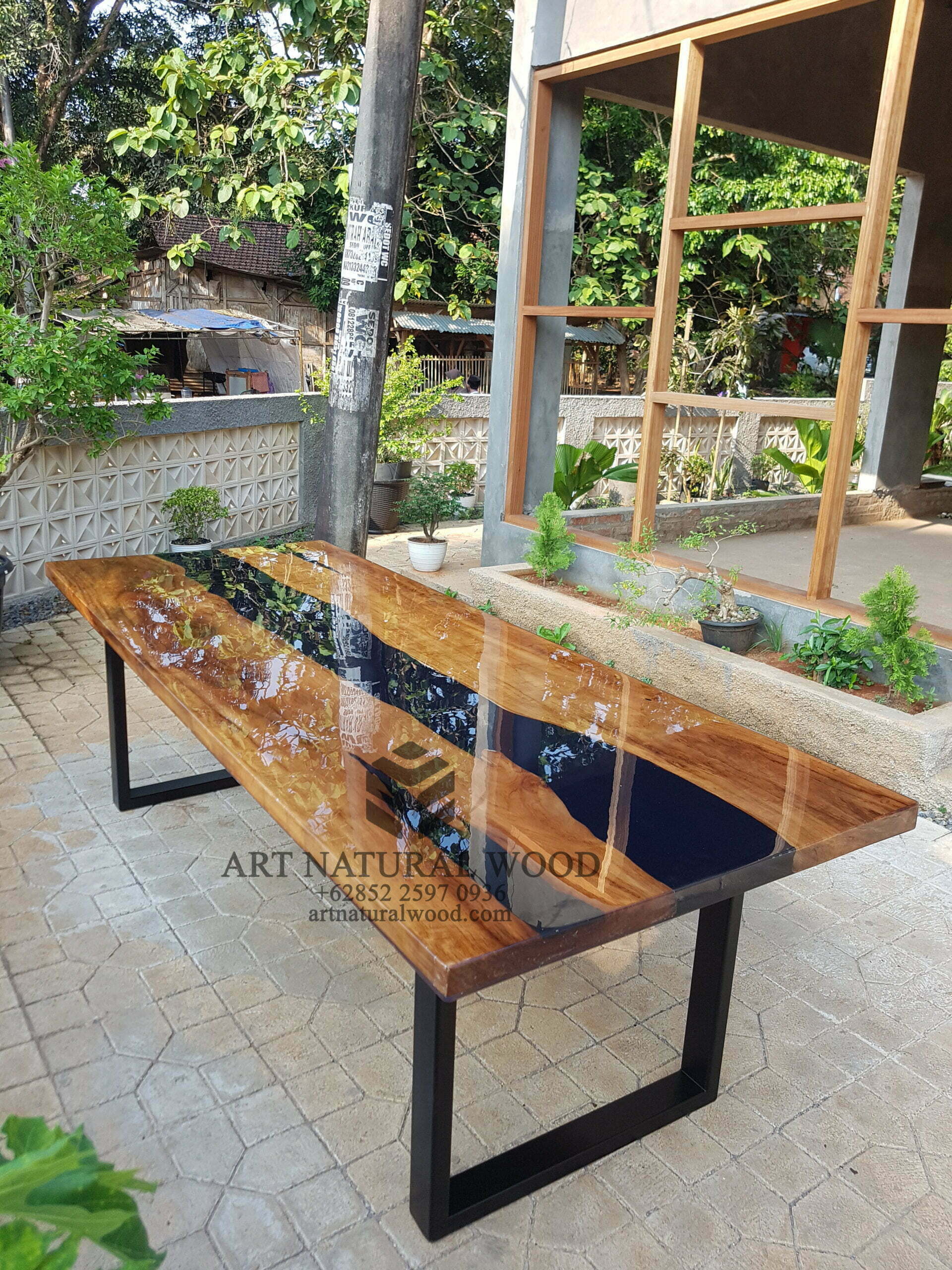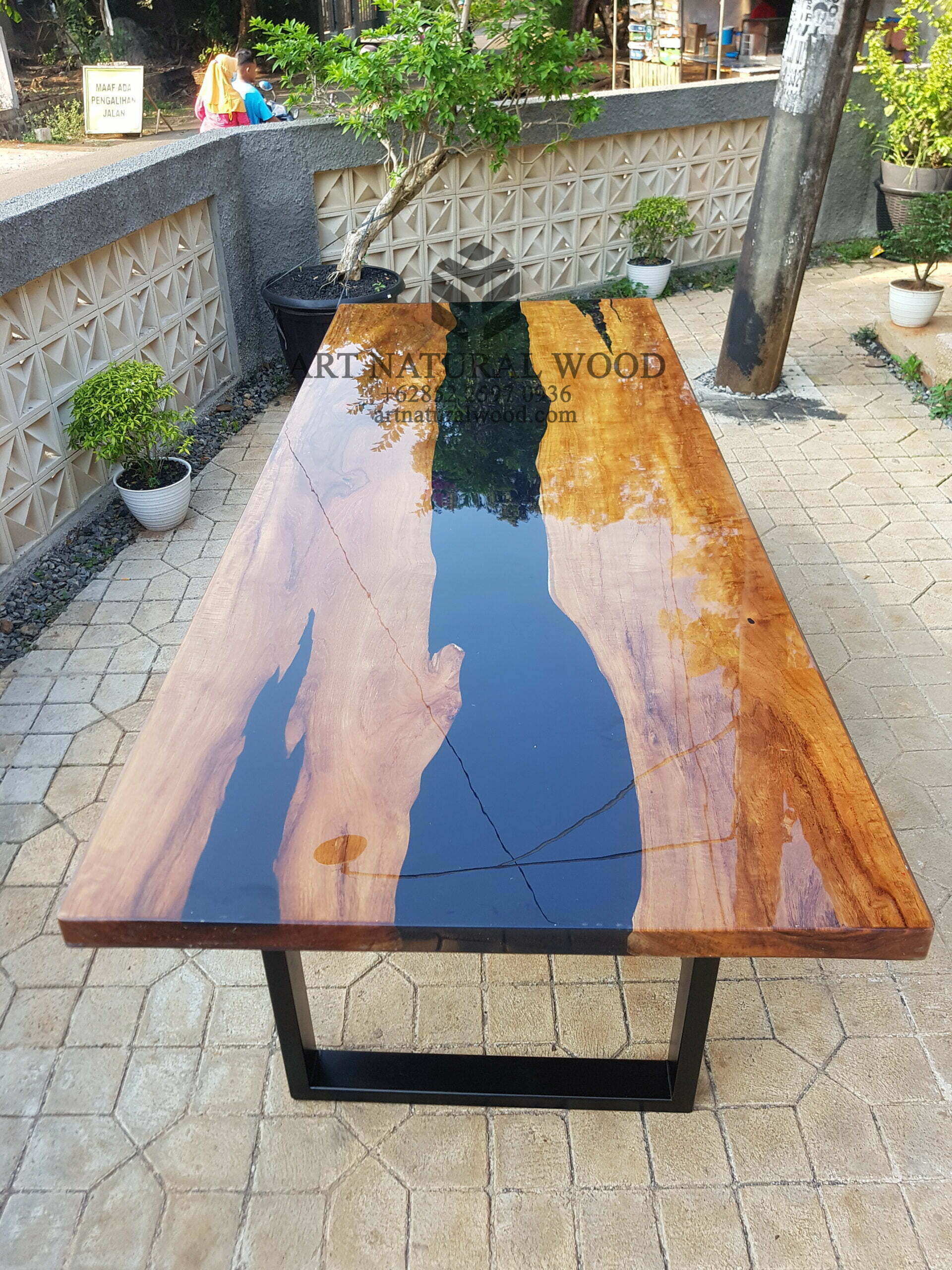 Meja rapat resin ini menggunakan bahan baku Kayu Jati utuh (Teak Wood), kaki-kaki besi dengan warna hitam sebagai aksen tambahan dan juga sentuhan resin sebagai aksen tambahan yang menambah nilai estetika furniture ini. Ditambah dengan konstruksi/purus. Produk-produk dari Art Natural Wood dekerjakan oleh para profesional dibidang furniture dari Jepara. Dikerjakan dengan teliti dan cermat sehingga furniture ini menjadi produk yang kokoh, kuat dan memiliki fungsi guna.