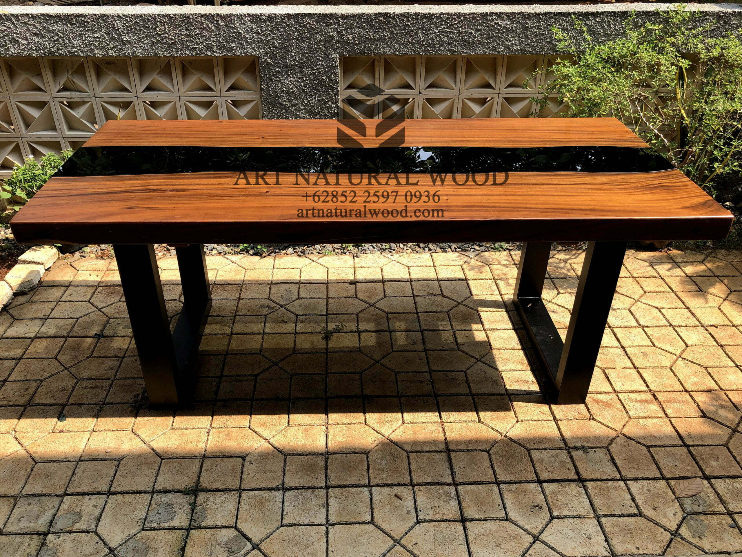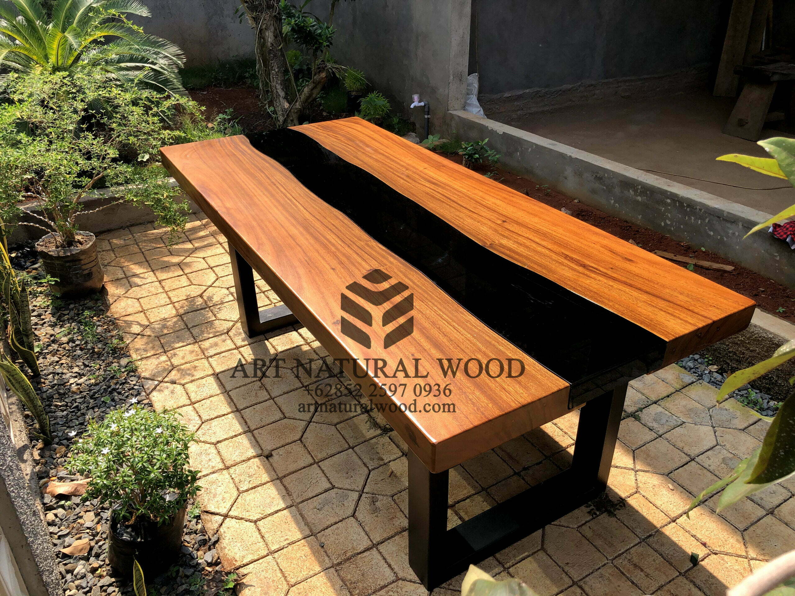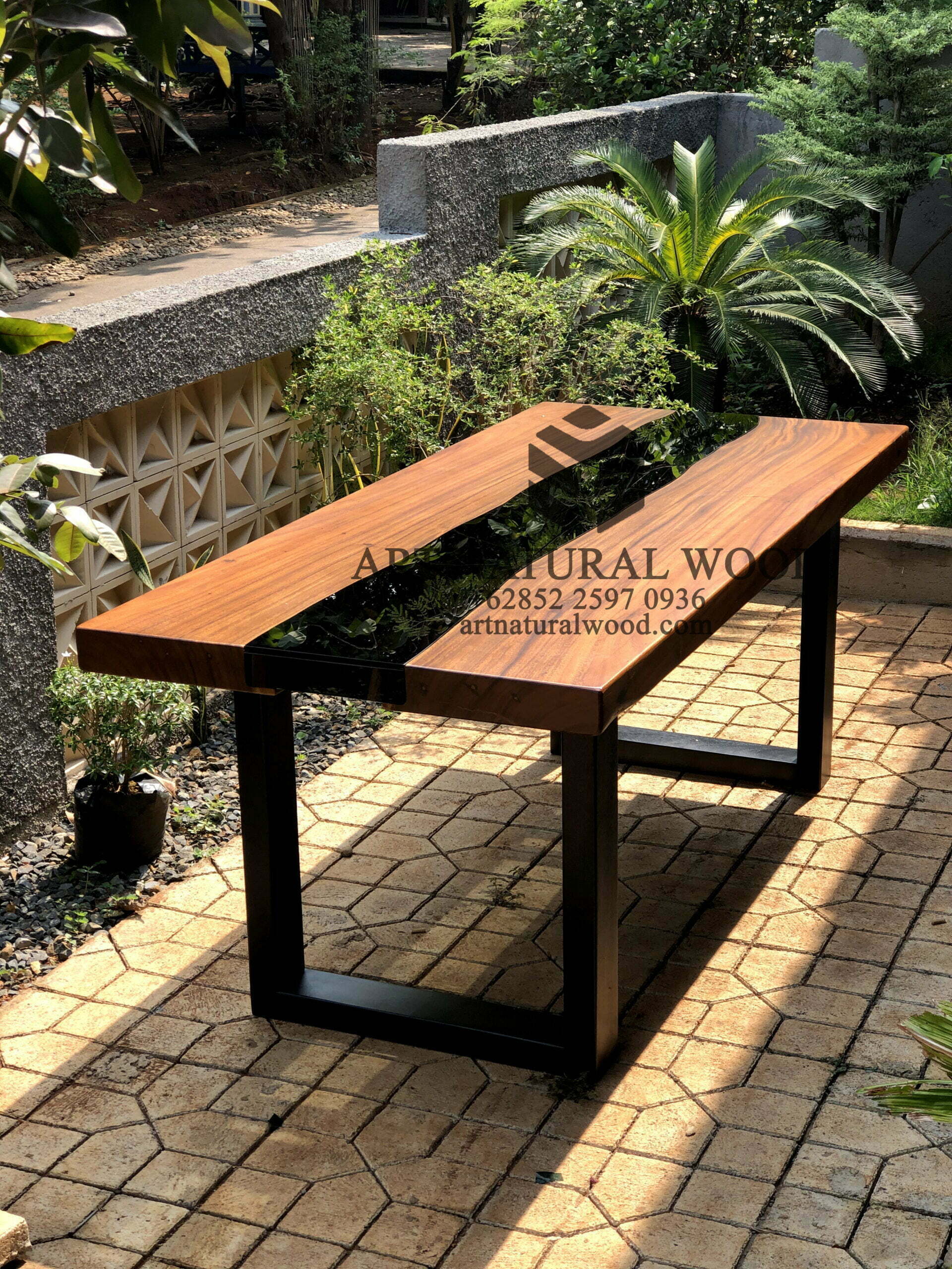 Meja river kaca ini menggunakan bahan baku Kayu Trembesi utuh (Suar Wood), kaki-kaki besi dengan warna hitam sebagai aksen tambahan dan juga sentuhan resin sebagai aksen tambahan yang menambah nilai estetika furniture ini. Ditambah dengan konstruksi/purus. Produk-produk dari Art Natural Wood dekerjakan oleh para profesional dibidang furniture dari Jepara. Dikerjakan dengan teliti dan cermat sehingga furniture ini menjadi produk yang kokoh, kuat dan memiliki fungsi guna.
