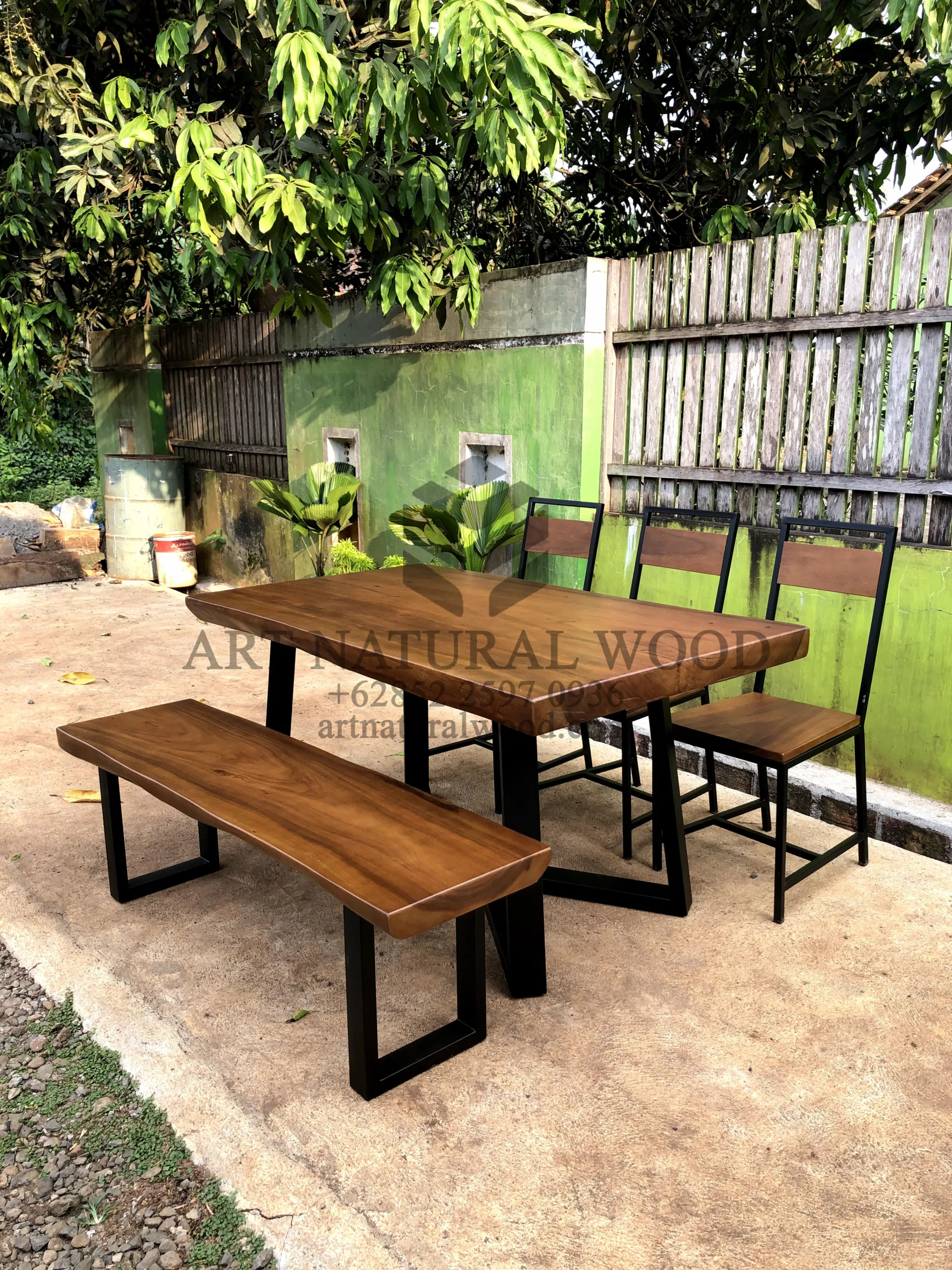 Set meja makan industrial kayu trembesi ini menggunakan bahan baku Kayu Trembesi utuh (Suar Wood) dan ditambah dengan konstruksi/purus. Produk-produk dari Art Natural Wood dekerjakan oleh para profesional dibidang furniture dari Jepara. Dikerjakan dengan teliti dan cermat sehingga furniture ini menjadi produk yang kokoh, kuat dan memiliki fungsi guna.