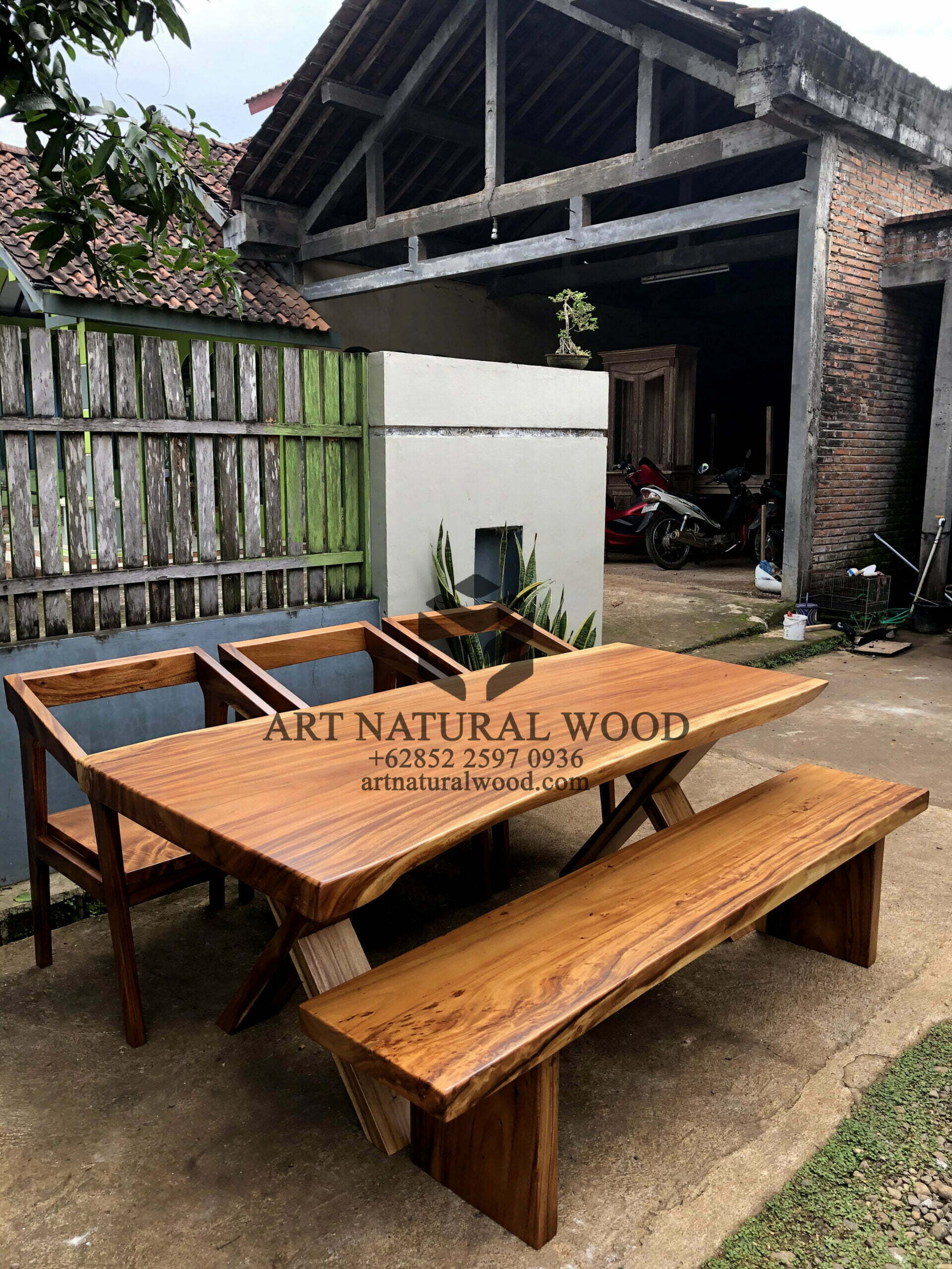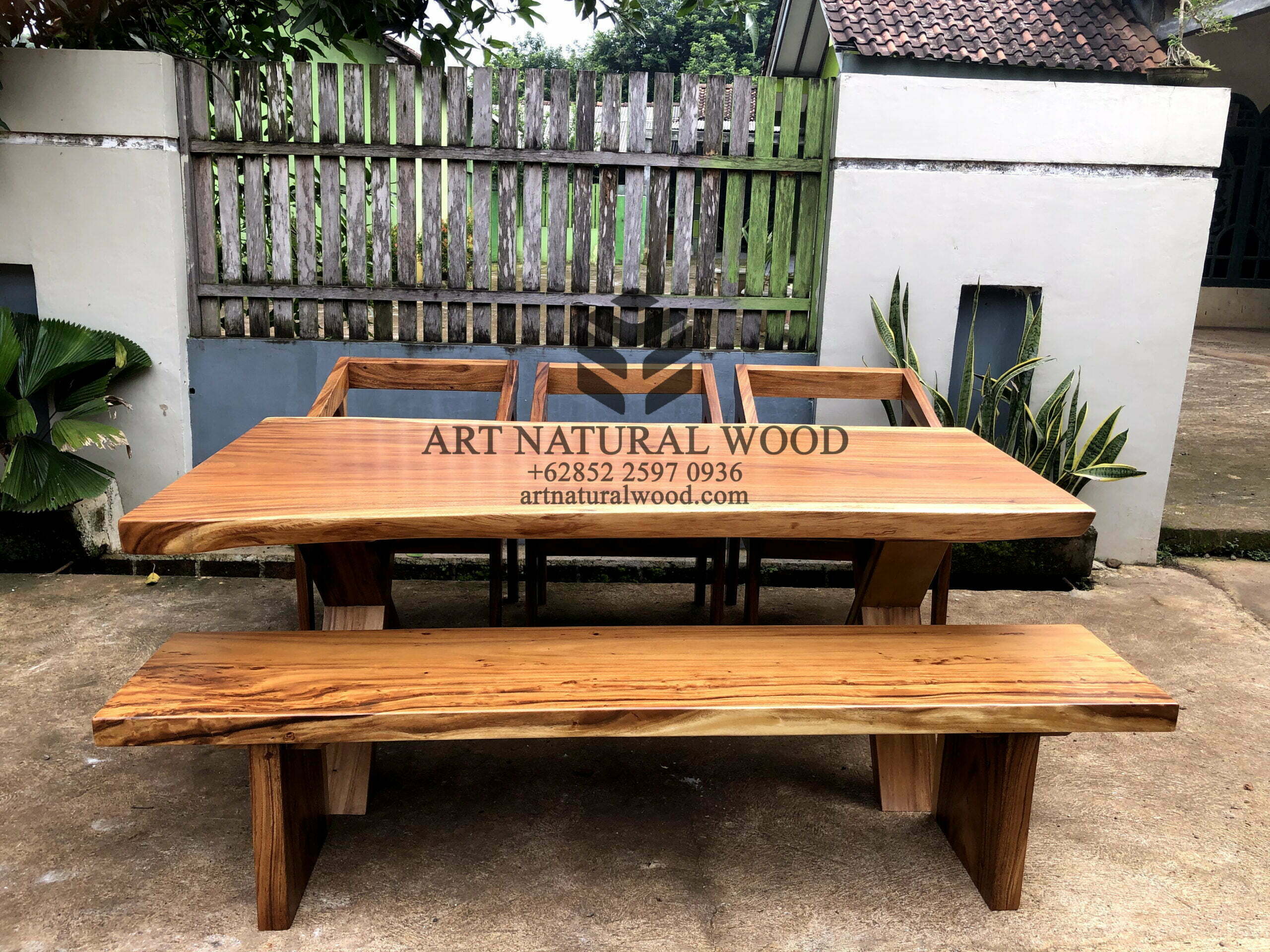 Set meja makan kayu ini menggunakan bahan baku Kayu Trembesi utuh (Suar Wood) dan ditambah dengan konstruksi/purus. Produk-produk dari Art Natural Wood dekerjakan oleh para profesional dibidang furniture dari Jepara. Dikerjakan dengan teliti dan cermat sehingga furniture ini menjadi produk yang kokoh, kuat dan memiliki fungsi guna.